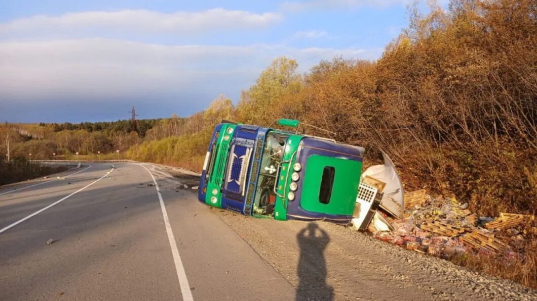 В Ванинском районе Хабаровского края перевернулся грузовик, груженый пивом.