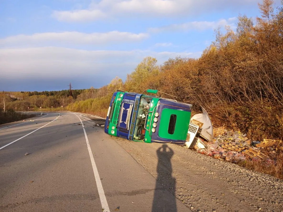 ДТП произошло во вторник, 14 октября, на 528 км трассы «Хабаровск-Лидога-Ванино». Большегруз Freightliner съехал в кювет.