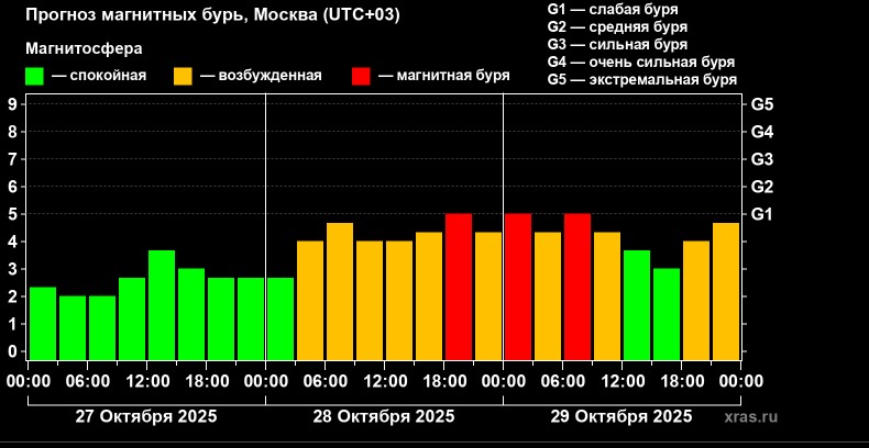 «Сразу две корональных дыры с номерами 91 и 92 выходят в центральную часть солнечного диска, начиная оказывать возможное воздействие на магнитосферу Земли. В такой ситуации ожидается, что Земля будет пересекать поток солнечной плазмы, вырывающейся из этих корональных дыр во вторник и среду. Начнутся возмущения геомагнитного поля уже во второй половине ближайшей ночи, а окончательно завершатся только в четверг. При этом во второй половине дня 28 октября и в первой половине 29 октября возможны магнитные бури», — сообщил в своем телеграм-канале ведущий специалист центра погоды «Фобос» Михаил Леус.