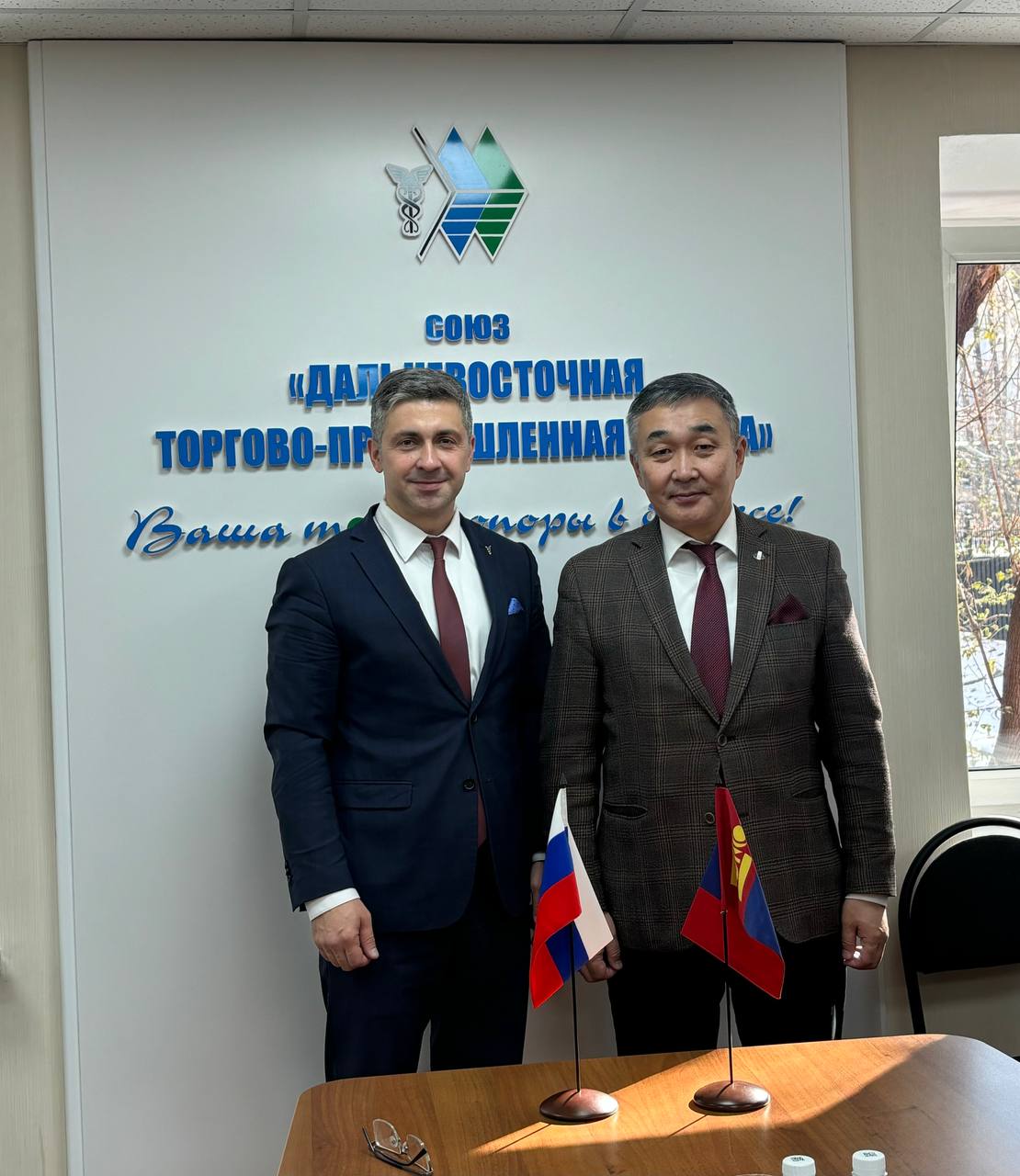 Перспективы и развитие бизнес-сотрудничества обсудили вице-президент Торгово-промышленной палаты Хабаровского края Петр Янченко и Генеральный консул Монголии в Улан Удэ Цэрэндорж Ганхуяг.