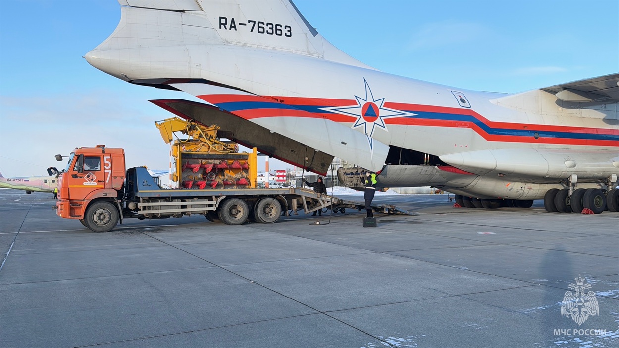 На борт самолета Ил-76 уже загружены два погрузчика с навесным оборудованием. Всего для помощи региону планируется направить около семи единиц техники.
